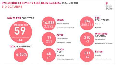 Como parte de las labores de vigilancia permanente y coordinada que Govern y Consell de Mallorca realizan de la evolución de la pandemia de COVID-19 en las residencias de Balears, el día 2 de octubre se cribó este centro después de que 1 de sus trabajadores diera positivo en la prueba PCR para detectar el SARS-CoV-2. A raíz de este cribado, ayer se supo que 17 de los 19 usuarios (90 %) estaban infectados por el virus, así como otros 3 trabajadores (4 en total). Asimismo, los 2 usuarios que de momento son negativos son considerados contactos estrechos y, por lo tanto, tienen que estar aislados durante 10 días.
