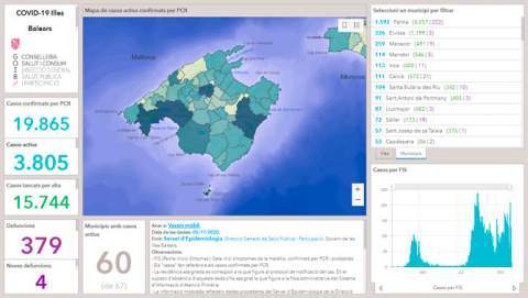 La situación epidemiológica sigue difiriendo entre las diferentes islas. El día 3 de noviembre, la isla más afectada era Eivissa, con una IA14 de 336,01 casos por 100.000 habitantes y una tasa de positividad del 11,39%. Le sigue Mallorca, con una IA14 de 239,95 y una tasa de positividad del 6,45%. Menorca y Formentera presentan indicadores más buenos, con unas IA14 de 115,64 y 57,8 casos por 100.000 habitantes y tasas de positividad del 3,55% y 4,76%, respectivamente.
